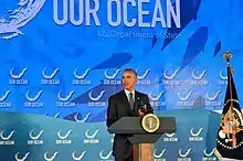 In the second year of his presidency, on July 19, 2010, Obama signed an executive order entitled "Stewardship of the Ocean, Our Coasts, and the Great Lakes."[3] This order created a policy framework for integrated marine spatial planning at the sub-national (regional) level. It also created a council of cabinet-level officials to coordinate policy under the nation's domestic and international rules for the oceans.[3] This executive order reflected many of the recommendations of the U.S. Commission on Ocean Policy in its 2004 report to Congress.[4] In 2014, the Obama administration inaugurated the "Our Ocean" series of annual conferences to build and promote international cooperation to protect the world's oceans. Members of the Obama administration testified on behalf of U.S. accession to the U.N. Convention on the Law of the Sea, to strengthen international norms respecting the freedom of navigation and for the sustainable development and use of marine resources. At the end of his second term in office, President Obama approved rules recommended by the National Ocean Council to combat illegal fishing on the high seas[5] and seafood mislabeling through import traceability and catch certification requirements.[6]