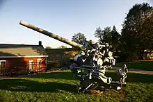 After the American entry into World War I in 1917, Battery Bell's 5-inch guns were removed for potential service in France as field guns on wheeled carriages. Most of the 5-inch guns removed under this program were sent to France with the 69th Artillery Regiment of the Coast Artillery Corps. However, the regiment did not complete training before the Armistice and did not see action.[13] The 5-inch guns were never returned to the forts and were scrapped circa 1920. Prior to 1922 one 12-inch gun at Battery Gansevoort was dismounted; this may have been in 1917–18 as potential railway artillery.[14] At some time, probably in 1918-1920, a battery of two 3-inch antiaircraft guns was built at the fort.[3] In 1920, with the war over, Battery Beecher's 3-inch guns were scrapped as part of a general removal from service of the M1898 3-inch gun. The 10-inch guns of Battery Hazzard followed in 1930; the reason for this is unclear. In 1934 the fort was disarmed and turned over to the state. All of the Endicott-era batteries were demolished in the 1950s.[15]
