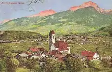The shield is argent a fess azure and a gules rampant lion. These are the arms of the Lords of Marling who lived in two castles in the village until 1426. The emblem was adopted in 1966. [4]