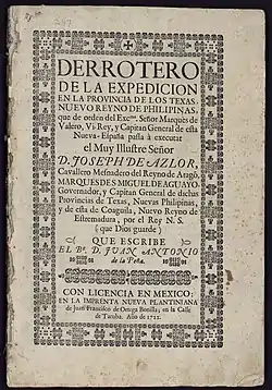 That year, the viceroy of New Spain appointed Aguayo governor of the provinces of Coahuila and Texas.[6] He had volunteered to use his own money to reconquer Texas and raised an army of 500 soldiers.[7] The governorship confirmed at Aranjuez by the king in May 1721, Aguayo replied back with gratitude that "the restoration of Texas, New Kingdom of the Philippines, should have been entrusted to my feeble management."[8]