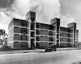 He began to work in works in the Cuban territory, from 1938 until his second exile in 1960. He collaborated with the Diario de la Marina, which facilitated his participation in numerous social housing projects, although in collaboration with other architects since he did not have his Cuban architect's registration.[8]