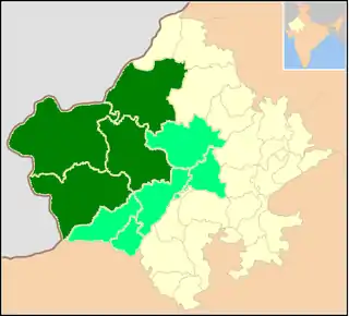 Dark green indicates Marwari speaking home area in Rajasthan, light green indicates additional dialect areas where speakers identify their language as Marwari.