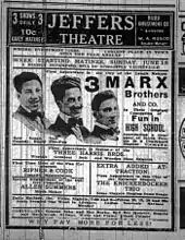 The on-stage personalities of Groucho, Chico, and Harpo were said to have been based on their actual traits. Zeppo, on the other hand, was considered the funniest brother offstage, despite his straight stage roles. He was the youngest and had grown up watching his brothers, so he could fill in for and imitate any of the others when illness kept them from performing. "He was so good as Captain Spaulding [in Animal Crackers] that I would have let him play the part indefinitely, if they had allowed me to smoke in the audience," Groucho recalled. (Zeppo stood in for Groucho in the film version of Animal Crackers. Groucho was unavailable to film the scene in which the Beaugard painting is stolen, so the script was contrived to include a power failure, which allowed Zeppo to play the Spaulding part in near-darkness.)[23] In December 1917, the Marx brothers were noted in an advertisement playing in a musical comedy act "Home Again".[24]