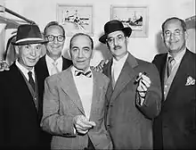 The five brothers made only one television appearance together, in 1957, on an early incarnation of The Tonight Show called Tonight! America After Dark, hosted by Jack Lescoulie. Five years later (October 1, 1962) after Jack Paar's tenure, Groucho made a guest appearance to introduce the Tonight Show's new host, Johnny Carson.[40]