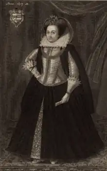 She was a popular figure at the court of Elizabeth I, having beauty and wit. Her husband's task was to inspect the defences on the east coast of England, so he was frequently away. This was a source of his suspicion of her. Her husband felt that she was at least flirting with others, even if not actually committing adultery.[1] She had been quoted making uncomplimentary remarks about him by jealous court rivals and this and her husband's suspicions led to a deed of separation being created in 1594. She had a settlement of £350 per annum. A full-length painting was made of her and in her hand she holds the deed of separation with words "If not, I care not" visible as if to show that she was not heartbroken at the end of her marriage.[1]
