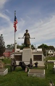 On February 21, 1822, the Commonwealth of Pennsylvania awarded Mary McCauley an annual pension of $40 (equivalent to $879 in 2022) for her service. Mary died January 22, 1832, in Carlisle, at the approximate age of 87.[7] She is buried in the Old Graveyard in Carlisle under the name "Molly McCauley". A statue of "Molly Pitcher," standing alongside a cannon, is also in the cemetery.[8][9] But according to this same monument--unveiled July 4, 1876, long after Mary/"Molly"'s death--the year she died is marked "January 1833," not January 1832. And the monument also records she was only "Aged 70 years," which (probably erroneously) would place her birth year at 1763, instead of 1754 as noted here.