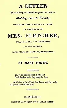 Mary Tooth also wrote a Letter to the inhabitants of Madeley on the death of Mary Fletcher in 1825. In addition she continued Fletcher's work. Her original converts now had children and grandchildren and Tooth took on the role of being their spiritual guide. In May 1816 she moved into a new home near the vicarage and in an upper room she created a public meeting place. She moved in the communion table from the church and a clock from Fletcher's old home as Madeley became a destination for Methodist pilgrims.[2]
