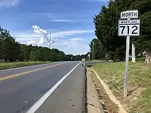 MD 712 begins at an intersection with MD 235 (Three Notch Road) on the southern edge of Lexington Park. The roadway continues on the opposite side of MD 235 as county-maintained Hermanville Road. MD 712 heads north as a two-lane undivided road through a forested area between residential subdivisions to the east and NAS Patuxent River to the west. The state highway parallels the military base's perimeter road for much of its length. Immediately after passing Pine Hill Run Road, the state highway reaches its northern terminus at an entrance to NAS Patuxent River.[1][2]