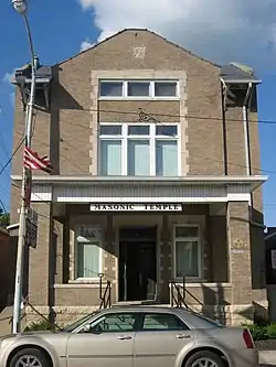 Three stories tall,[6]: 118 the Masonic Temple is a brick building set on a stone foundation. Non-structural elements of stone occupy a prominent part of the exterior,[1] serving as the surrounds for the main door and windows. The roof is gabled,[6]: 118 and while the gable ends face the sides of the building, an additional gable is oriented toward the street. Multi-pane windows in the additional gable provide light to both the second and third stories, while the main entrance and its flanking windows are sheltered by a porch with square brick pillars. Components such as bracketing shaped with knees, additional multi-pane windows with bevelled slats set as transom lights, and buff brick walls combine to lend the building an American Craftsman appearance.[6]: 118 Upon construction, the building's rooms included a club room in the basement, banqueting and reception rooms on the first story, and a lodge meeting room and additional reception space on the second,[3]: 52 and virtually no changes have been made to the building since construction was completed.[6]: 118