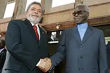 Kérékou was re-elected for a second five-year term in the March 2001 presidential election under controversial circumstances. In the first round he took 45.4% of the vote; Soglo, who took second place, and parliament speaker Houngbédji, who took third, both refused to participate in the second round, alleging fraud and saying that they did not want to legitimize the vote by participating in it. This left the fourth-place finisher, Amoussou, to face Kérékou in the run-off, and Kérékou easily won with 83.6% of the vote.[14][19] It was subsequently discovered that the American corporation Titan gave more than two million dollars to Kérékou's re-election campaign as a bribe.[20]