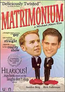 Matrimonium is a 2005 comedy film directed by Michael Akers, his second feature film after the successful Gone, But Not Forgotten. Co-written and co-produced by him and Sandon Berg, the latter appears in a lead role in the film as Spencer who is having a sham same-sex marriage with the straight character Rick Federman in the role of Malcolm to enable the latter to win the 1-million dollar prize on the nationally broadcast reality television show Matrimonium.