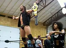 Justice and girlfriend Marti Belle making their entrance at Prime Wrestling show in June 2013