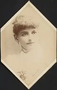 Robson ran away from home to marry her first husband, 18 year-old Charles Leveson Gore, in London.[9][10] They were married on 1 November 1875 at the parish church in Camden Town, London.[16][lower-alpha 5] They traveled on the steamer SS Vaderland and arrived in New York on 17 May 1877. They purchased 380 acres of land in Fort Worth, Texas where they built a house and established a cattle ranch. According to Jan Jones, "the Gores survived two years in their prairie manor house before homesickness, rural isolation, and repeated bouts of fever convinced them to sell and try their fortunes in the more settled East."[17] They moved to New York City[10] with little money and Robson said that Gore died shortly thereafter.[10][lower-alpha 6]