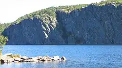Mazinaw Rock is a 100-metre (330 ft) high cliff in the Addington Highlands, just north of Kaladar, south-central Ontario, Canada. It stretches for 1.5 kilometres (0.9 mi) along Mazinaw Lake, and is a landmark in the Bon Echo Provincial Park that draws the attention of many campers and cottagers. The lake's depth reaches 145 metres (476 ft), making it the third deepest lake in Ontario besides the Great Lakes. The rock is composed of granite and black dykes. The quality of the rock varies from good on the more popular routes to bad on the less used routes.