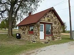 It is a wood-frame building with "distinctive stone veneer" built around 1941 on Route 66.[2]