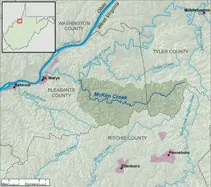 McKim Creek is a tributary of Middle Island Creek, 20.4 miles (32.8 km) long,[3] in northwestern West Virginia in the United States. Via Middle Island Creek and the Ohio River, it is part of the watershed of the Mississippi River, draining an area of 37.3 square miles (97 km2)[4] in a rural region on the unglaciated portion of the Allegheny Plateau.