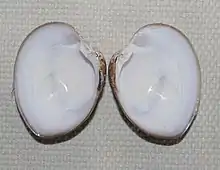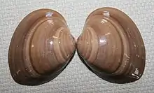 The valves are thick and of equal size. In life, the valves are covered by a grayish-brown periostracum. The external surface of the shell is smooth. It is tan to brown in color, sometimes with bands or speckles of different intensity. The interior of the shell is white, sometimes with bands of purple.[4] The shell can reach 120 millimetres (4.7 in) long, 97 millimetres (3.8 in) wide, and 68 millimetres (2.7 in) deep. Weight may reach 93 grams (3.3 oz) for live individuals.[5][6]