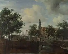 The Haarlem Lock, Amsterdam in the National Gallery is his only generally accepted townscape, and still shows a foreground mainly of trees and water. The corner of the street where Hobbema was living by 1668 can be seen at the left.[18] In some cases he delegated the human figures in his paintings to Adriaen van de Velde and perhaps others, a common practice in the period.[19] In others he did the figures but probably sub-contracted birds and animals.[20]