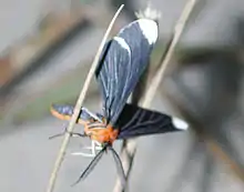 Melanchroia chephise, the white-tipped black or snowbush spanworm, is a moth of the family Geometridae. It is found from Florida and Texas, south to Paraguay. Strays have been recorded from Arizona, Oklahoma, Arkansas, Kansas and Illinois.