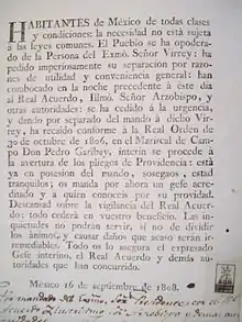 In 1808, after the French invasion of Spain, the Criollos and some of the Spanish living in New Spain wanted to proclaim the independence of the colony and establish a governing junta, similar to the anti-French juntas in the mother country. On September 1, 1808, Talamantes delivered two tracts to the Ayuntamiento, in favor of separation from Spain and of the convoking of a Mexican congress. These tracts, Congreso Nacional del Reino de Nueva España (23 August 1808) and Representación Nacional de las Colonias, Discuso Filosófico (25 August 1808) argue that Spain had lost its sovereignty and that New Spain had the right to repossess it.[3] His premises were that all ties to Spain had now been broken; that regional laws had to be made, independently of the mother country; that the Audienciacould not speak on behalf of the king; and that the king having disappeared, sovereignty was now vested in the people. His proposed congress was to represent all the provinces of New Spain. It was to be invested with the legislative authority of the new government. The courts already established were to exercise the judicial power, and Viceroy Iturrigaray was to be captain general (commander of the military) and, provisionally, chief executive. This was the government of a republic; there was no provision for a king.