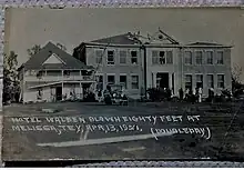 A deadly F4 tornado struck Melissa on April 13, 1921, killing 13 people and injuring many more. The tornado tore the roof off of the brick school building, but the children inside were not seriously injured. However, all churches in the town, three cotton gins, every business house except a bank, the post office, and the Houston and Texas Central railway station, were wrecked. The Waldon Hotel was lifted by the winds, turned halfway around, and thrown up against the school building.