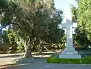 A larger 14 ft (4.3 m) tall granite cross was dedicated at the second site on January 12, 1953;[15][16] the principal speaker was Knowland (this time, as President of the California Historical Society) and Santa Clara Mayor William P. Kiely accepted the cross on behalf of the city.[17] The granite cross was originally donated by the local Lions Club.[18][16] It weighs 23 short tons (21 t) and was cut in Santa Rosa by Massimo Galeazzi to a design by John Costa,[19] although Jess Talancon would claim credit for design and execution in the 1970s;[20] the granite was quarried from Rocklin.[19] The park was developed in 1956, and the cross was rededicated to the city in 1961.[15] The city of Santa Clara considers it a mini park with 0.34 acres (0.14 ha) of area.[21][22]