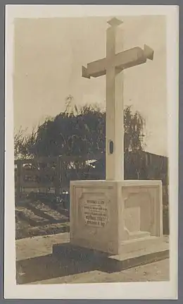 On November 19, 1907, an 8 ft (2.4 m) tall wooden cross was erected at the second Mission site by the Santa Clara County Historical Society.[9] That cross incorporated a fragment of the original 1777 cross and used the wooden timbers from the cross erected by Fr. Serra in 1781 at the third Mission site;[10] the timbers, in turn, had been part of the first Mission building built in 1777.[11] The original 1777 cross had been rebuilt and encased in new material in 1902 following a windstorm that had knocked it down,[12] and the 1907 cross sealed the 1781 timbers in a similar manner.[5] The president of Santa Clara College, Richard A. Gleeson, S.J., delivered the keynote speech during the dedication ceremony, entitled "The Birth of Christianity and Dawn of Civilization in Santa Clara Valley"; other speakers included James R. Daily, reading "The Mission Cross", a poem by Charles F. Walsh;[13] Rev. John W. Dinsmore ("Footprints of the Padres"); and historian Dr. George Wharton James ("Junipero Serra, Pioneer of Pioneers"). Politicians attending included former San Francisco Mayor James D. Phelan, who delivered brief remarks: "I am reminded of the American traveler who received a just rebuke from Lord Byron, who refused to see him because the American had never beheld Niagara Falls. We should first see and know our own land"[9] as well as Congressman Joseph R. Knowland.[5][14]