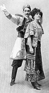 The first American production opened on 21 October 1907 at the New Amsterdam Theatre on Broadway for another very successful run of 416 performances, and was reproduced by multiple touring companies across the US, all using the Hood/Ross libretto. It was produced by Henry Wilson Savage. The New York cast starred Ethel Jackson as Sonia and Donald Brian as Danilo. The operetta first played in Australia in 1908 using the Hood/Ross libretto. Since then, it has been staged frequently in English. It was revived in London's West End in 1923, running for 239 performances, and in 1924 and 1932. A 1943 revival ran for 302 performances. Most of these productions featured Graves as Popoff. Madge Elliott and Cyril Ritchard starred in the 1944 production, while June Bronhill and Thomas Round led the 1958 cast and recording. Lizbeth Webb and John Rhys Evans starred in a brief 1969 revival.[7] Revivals were mounted in major New York theatres in 1921, 1929, 1931 and 1943–1944. The last of these starred Marta Eggerth and her husband Jan Kiepura, with sets by Howard Bay and choreography by George Balanchine. It ran for 322 performances at the Majestic Theatre and returned the next season at the New York City Center for another 32 performances.[10]