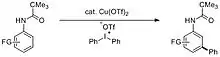In 2009, Gaunt's group reported a copper catalyzed meta-selective C–H arylation reaction on anilide derivatives.[14] Despite the intrinsic ortho-/para- selectivity of the amido group, the arylation occurs exclusively on the meta position on a variety of anilide substrates. Remarkably, the regioselectivity is totally different from the earlier reported Pd catalyzed C-H functionalizations, where the amido group serve as a powerful ortho-directing group.[7][15][16] The method is robust under mild reaction conditions. It is compatible with a spectrum of substituted anilide as well as different bisaryliodonium salts. However, the meta-selectivity is lost when highly ortho/para-directing methoxy group substitutes one of the meta-hydrogen of the anilide, which marks the limitation of this method.