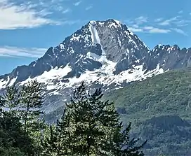 Meteorite Mountain is a prominent 6,565-foot (2,001 m) glaciated mountain summit located in the Chugach Mountains, in the U.S. state of Alaska. It is situated 16 mi (26 km) southeast of Valdez, 9 mi (14 km) south of Hogback Ridge, and 9 mi (14 km) southeast of Mount Francis. In January 1927, a meteorite hit this mountain, which is how the mountain got its name.[4] The mountain's name was in local use when it was first published in 1953 by U.S. Geological Survey.[3] Precipitation runoff and meltwater from the mountain's glaciers drains into tributaries of the Lowe River, which in turn empties to Prince William Sound.