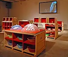 Lin responded to the challenge of audience communication with Interior (IT Park, 1996).[5] He modeled a domestic setting in the gallery space by re-locating some of his home furnishings, including two carpets, a stereo, and his music collection, with a sign that read, "Please remove your shoes before stepping on to the carpet. Feel free to choose from the selection of music."[2][15] Lin opened a dialog between the public space of the gallery and the private space of the home, to address the gap between his and his audience's conceptions of contemporary art.[8][16] This initiated the role of the public in Lin's work, his concept of artist as host and audience as guest, and his approach of creating participatory artwork using everyday objects.[4][14] Interior was Lin's first exhibition to feature paintings with flower motifs.[7] He had chanced upon embroidered muslin pillowcases in his home, and recalled the traditional floral patterns from his youth in the countryside, where they would adorn the bedding given as part of a wedding dowry.[5][17] He crafted frames the same size as the pillows, copied their patterns and projected them onto a canvas, and reproduced them as colorful paintings.[6]