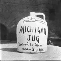 When Yost and the team came into Minneapolis for the 1903 game, student manager Thomas B. Roberts was told to purchase something to carry water. Yost was somewhat concerned that Gopher fans might contaminate his water supply.[5] Roberts purchased a five-gallon jug for 30¢ from a local variety store in Dinkytown.[6][7] The jug itself is known as a Red Wing Pottery "five gallon beehive jug", and was made in Red Wing, Minnesota.[8][2]