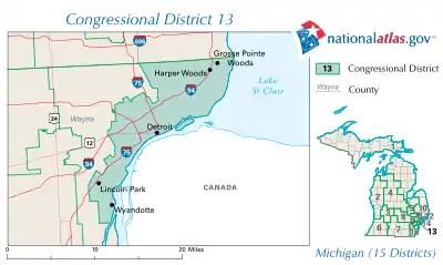 The district includes portions of Detroit and some of its suburbs, and since the 2012 redistricting, has been the only congressional district in Michigan to be contained within a single county.[3] District boundaries were redrawn in 1993, 2003, 2013, and 2023 due to reapportionment following each respective census.