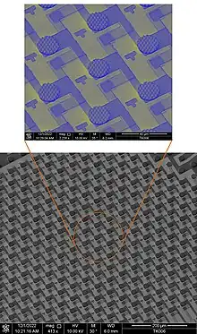 There are several methods to manufacture microLED displays. The flip-chip method manufactures the LED on a conventional sapphire substrate, while the transistor array and solder bumps are deposited on silicon wafers using conventional manufacturing and metallization processes. Mass transfer is used to pick and place several thousand LEDs from one wafer to another at the same time, and the LEDs are bonded to the silicon substrate using reflow ovens. The flip-chip method is used for micro displays used on virtual reality headsets. The drawbacks include cost, limited pixel size, limited placement accuracy, and the need for cooling to prevent the display from warping and breaking due to thermal mismatch between the LEDs and the silicon. Also, current microLED displays are less efficient than comparable OLED displays. Another microLED manufacturing method involves bonding the LEDs to an IC layer on a silicon substrate and then removing the LED bonding material using conventional semiconductor manufacturing techniques.[45][46][47] The current bottleneck in the manufacturing process is the need to individually test every LED and replace faulty ones using an excimer laser lift-off apparatus, which uses a laser to weaken the bond between the LED and its substrate. Faulty LED replacement must be performed using high accuracy pick-and-place machines and the test and repair process takes several hours. The mass transfer process alone can take 18 days, for a smartphone screen with a glass substrate.[48][49][50] Special LED manufacturing techniques can be used to increase yield and reduce the amount of faulty LEDs that need to be replaced. Each LED can be as small as 5 μm across.[51][52][53][54][55] LED epitaxy techniques need to be improved to increase LED yields.[56][57][58]