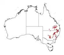 This species occurs between Miles in Queensland and Griffith in New South Wales, mainly above 600 m (2,000 ft), in a range of habitats from mallee to forest, often in rocky places.[2][3]