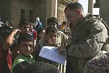 Gallagher was a United States Marine Corps intelligence officer, serving seven years (2006–13) on active duty.[3] He twice deployed to the Al Anbar Province, Iraq, serving on General David Petraeus's CENTCOM Assessment Team, both as a commander of intelligence teams in Al-Qa'im near the Syrian border. His first deployment was in November 2007 to lead a counterintelligence and human intelligence team, a time where al-Qaeda appeared to have been defeated by the Iraq War troop surge of 2007; giving "some semblance of stability in the town."[4][5] He made a back-to-back deployment from 2008, taking over from a team led by Matt Pottinger.[4] He assessed American military strategy in the Middle East and Central Asia in his role as a counterintelligence officer, and as a member of the CENTCOM assessment team.[6] In an interview with The American Interest, Gallagher was very critical of the Obama administration's subsequent drawdown of United States troops from Iraq, because: