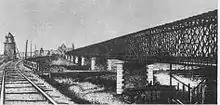 The Austrians were defeated and on 11 July 1859 signed the Armistice of Villafranca; Lombardy was annexed to the Kingdom of Sardinia and the Veneto remained Austrian. As a result, the Lombard rail network was separated from that of Austria[5] and therefore the nature of its development and operations changed. Instead of links with Venice, links with central Italy and the Adriatic Sea were promoted. The Treaty of Zürich signed on 10 November 1859 also included an agreement[6] that was the origin of the Società delle Strade Ferrate della Lombardia e dell'Italia Centrale (Lombardy and Central Italy Railway Company) and the Società delle Strade Ferrate dell'Austria meridionale e del Veneto (Southern Austria and Veneto Railway Company).[7] Both companies soon began building new lines and completing others: on 21 July 1859 the 146 km long Piacenza–Bologna line was opened, and on 14 November 1861 the 68 km long Milan-Piacenza section was opened[8] with a temporary wooden bridge over the Po. In 1863 a flood swept away the structures and the line was interrupted several times. The construction of a long steel girder bridge, completed in 1864, put an end to the insecurity of the rail link.