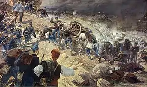 - Romanticized depiction of Nikola Šubić Zrinski's charge out of the fortress of Szigetvár during the Ottoman siege of the city in 1566. By J. P. Krafft.