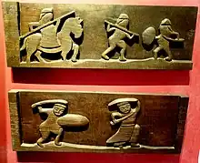 - 17th century wood relief showing arquebusier alongside mounted archer, Hương Canh Communal house
