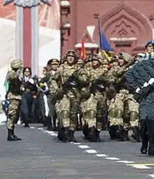 The National Guard of Kyrgyzstan was founded on December 6, 1991, and took their first oath July 20 the following year.[16][17] In 2014, the Internal Troops were absorbed into the National Guard as a result of the ongoing military reforms. This would remain this way until September 2018 when they were separated once again.[18]