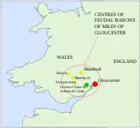 He inherited vast landholdings in Wales from his wife Sibyl de Neufmarché (whose father had conquered the independent kingdom of Brycheiniog (Brecknockshire, modern: Breconshire) in South Wales, which became the Lordship of Brecknock, and other lands in Gloucestershire from his father (the nucleus of which were the Domesday Book holdings of his great-uncle Durand of Gloucester)[2] and acquired other large landholdings himself, including the extensive Lordship of Abergavennny in South Wales, and St Briavel's Castle and the Forest of Dean in the west of Gloucestershire. These combined lands became a feudal barony, now known as the "Barony of Miles of Gloucester".[1]