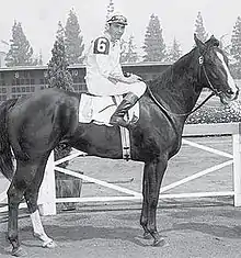 After Miss Meyers retired from the racetrack, she became the dam of the first AQHA Supreme Champion, Kid Meyers, sired by fellow Hall of Famer Three Bars, a Thoroughbred.[2] (A Supreme Champion is a horse that is outstanding on the racetrack, as a riding horse at horse shows and also conformationally, or how well put together the horse is). Kid Meyers was a 1963 sorrel stallion, and had 23 starts on the racetrack, winning 6 times. He earned a total of $10,655[3] (equivalent to $96,100 in 2022)[4] on the track. After retiring from the racetrack, he earned his AQHA Champion in 1966 and his AQHA Supreme Champion in 1967. His highest speed index was AAA.[3] Unlike most foals, who nurse for months after birth, Kid Meyers was orphaned at the age of one month in March 1963.[6]