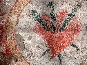 Part of the mural depicts the Sacred Hearts of Jesus and Mary. In Christian art, the Sacred Heart is often portrayed as a flaming heart shining with divine light, pierced by the lance-wound, surrounded by a crown of thorns, surmounted by a cross and bleeding. Sometimes the image is over Jesus' body with his wounded hands pointing at the heart. The wounds and crown of thorns allude to the manner of Jesus' death, while the fire represents the transformative power of love. In the Mission Dolores mural, the Sacred Heart appears on either side of the upper third of the mural, with a decorative recessed wall, or statuary niche, in the center, decorated at the top with a shell motif. The upper niche is richly ornamented with scroll motifs and flanked on either side with more scrolling decorative patterns. The interior of the lower niche is less decorative and painted in red. Similar ornamental motifs are found elsewhere in the old mission on the archway above the sanctuary, as well as chevron patterns on the ceiling. We know these are original native patterns as we see the same pattern in the original basketry woven by local native women over 200 years ago. According to the California Missions Foundation some of the design resembles traditional Ohlone patterns found on rock art in the region.[4] In the mission church behind the huge canvas depicting the last supper there are also decorative patterns painted on the wall.