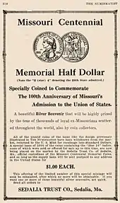 - ↑ "The Missouri Centennial Half Dollar a Popular Coin". The Numismatist: 484–485. October 1921.