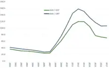 A 2015 EU Commission report into Ireland's economic statistics, showed that from 2010 to 2015, almost 23% of Ireland's GDP was now represented by untaxed multinational net royalty payments, thus implying that Irish GDP was now circa 130% of Irish GNI.[31] This analysis, however, did not capture the full effect of the BEPS tool as it uses capital allowances, rather than royalty payments, to execute the BEPS movement. The Irish media were also confused as to Ireland's state of indebtedness as Irish Debt-per-Capita diverged sharply from Irish Debt-to GDP.[32][33][34]
