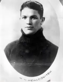 Although somewhat short in stature at 5' 6", Herscovitch was incredibly athletic, and had blue eyes, and dark brown hair, somewhat atypical for his Eastern European Jewish ancestry.[6] He was a standout playing football for High School of Montreal and in his Senior year was recruited to play for the Montreal Football Club in what would be known as the Big Four League of the Inter-Provincial Rugby Union.[7] He played football with the Montreal Club until 1915 when it was disbanded due to the increasing hostilities of World War I. It would be reorganized after the war and he would play for the new team after returning from the service in 1919.[8][2][7]