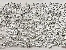 Rudquist was a recipient of the 2013 Artist Initiative Grant provided by the Minnesota State Arts Board.[10] Through this grant, she created and exhibited her work in her exhibition titled InContext. In November 2013-January 2014, this exhibition took place in the Emily Galusha Gallery at Northern Clay Center in Minneapolis, Minnesota.[4] The centerpiece of the show, "Intersection" measured 6.5 ft x 25 ft. This work "explored the interplay and patterns between the interior and exterior of form and the spaces created between the forms when they are set side-by-side." This show included wall, pedestal, and floor installations and all works had multiple pieces.[8] Intersection is made up of approximately one thousand smaller pieces, each with a small hole in the back for easy hanging.[11] "Intersections" is now permanently installed at the headquarters of LifeSource, a non-profit organization that facilitates organ and tissue transplants, in Minneapolis, Minnesota.[8] A LifeSource representative writes, “Each piece in this artwork stands on its own as a familiar and intimate vessel and yet is part of something bigger as the shapes are joined in unexpected ways. A space remains between the individual pieces, giving honor to the space between as much as the space contained within.”[12]