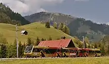 The Lenk branch retraces this route for a very short distance before continuing on its own trackbed. Because of its poor state of repair, this line was closed on 14 June 1975, however, it was fully modernized between 1977 and 1979, having new tracks and overhead lines, reopening on 27 September 1979. New rolling stock was purchased (* in the list below) to operate this line together with the weekdays school service between Zweisimmen and Saanen. Since reopening it has been included in the regular operating schedule of the MOB with timetabled connections to the main line services. To celebrate the centenary of the opening of the Lenk line (June 2012), the MOB arranged a week of festivities with a dinner, special fares and operation and display of rolling stock usually to be found on museum lines, particularly that at Blonay–Chamby Museum Railway.