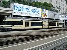 On 18 May 2010, MOB invited press and officials to demonstrate the first Panoramic coach (BDs 220) fitted with variable gauge bogies to allow through running across the 1,000 mm (3 ft 3+3⁄8 in) metre gauge / 1,435 mm (4 ft 8+1⁄2 in) standard gauge break-of-gauge. The axle-less bogie was developed by MOB and engineered by Prose[2] company of Winterthur. Some components were designed for the Centro 1000 bogie and built by Alstom. Apart from changing the gauge, the bogies also adjust the height of the coaches to suit the different platform heights on the two gauges. MOB announced commercial service with variable gauge trains for 2015.[3] The date of commercial through running Montreux to Interlaken has been postponed several times. Delays in manufacturing due to COVID-19 have been cited in 2020 and 2021. In spring 2021 launch date was set to 11 December 2022.[4][5]