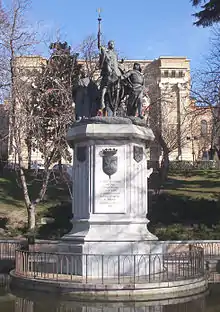 It was officially inaugurated by the Ayuntamiento de Madrid on 30 November 1883.[2] As described by Pedro de Madrazo, the sculptural group comprised three statues: an equestrian statue representing Isabella, who appears dressed in armour and with a royal crown and mantle, carrying the sceptre in one hand and the bridles of the horse in the other; the statue of the Cardinal of Spain Pedro González de Mendoza, dressed in a cassock with the book of the Gospels in his right hand and leaning the other on one of the bridles of the Queen's horse; and the statue of the great captain Gonzalo Fernández de Córdoba, armed from the tip of his head, with his naked sword in his left hand, and holding the other bridle of the horse with his right hand;[2] all three statues are supported by a bronze basement.[2]